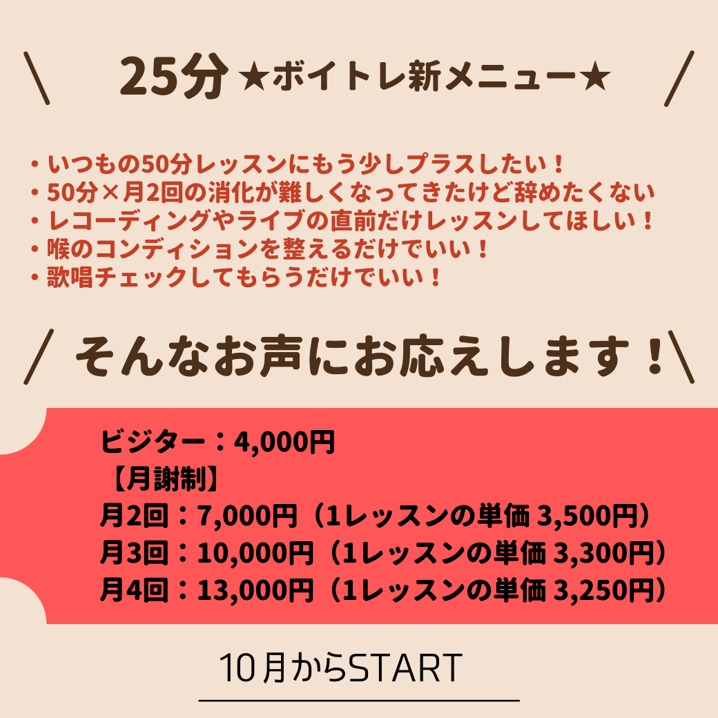 気づけば10月も後半に突入ですあっという間に年月が経っていくことを実感中のカインドアイランド代表兼ボイストレーナーのやすこですさてさて、ボイトレに新メニューが登場しました★10月中は既存の生徒さ…