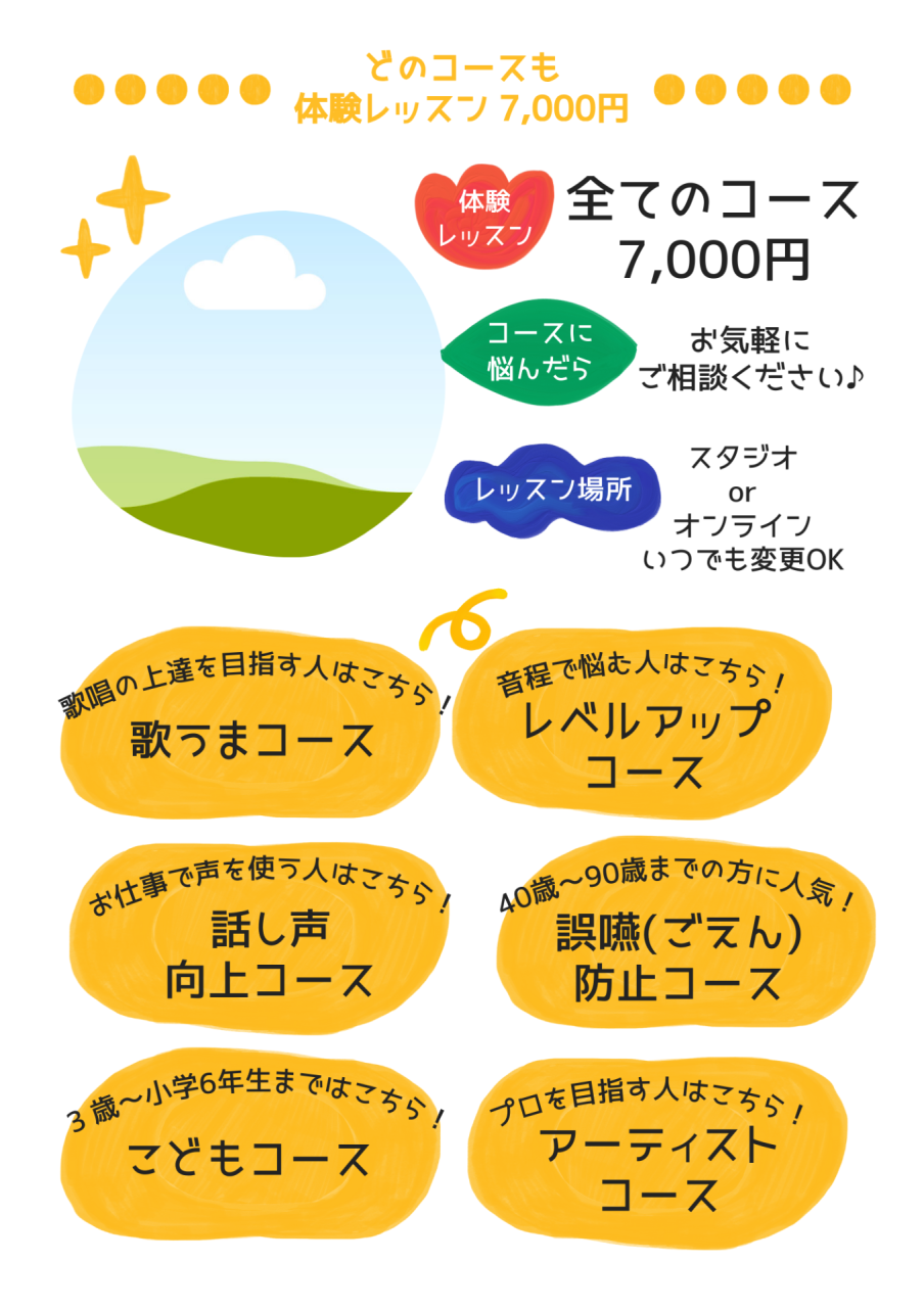 音程が思ったようにとれない…リズム感がないと言われる…などなど、歌うことや話すこと、声を出すこと自体にお悩みがある方にもおすすめのコースです💕 苦手意識を共に克服できるよう、お力添えをさせてください![]()
